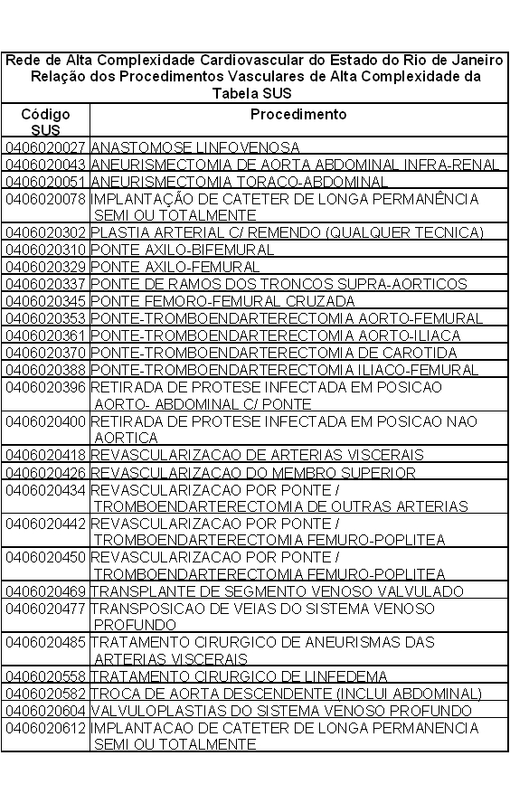 Art. 1º - Aprovar, em caráter provisório, o pagamento administrativo pela SES/RJ, a título de complementação dos procedimentos vasculares de alta complexidade listados no Anexo desta Deliberação, quando realizados exclusivamente nos Serviços credenciados e habilitados da Rede de Alta Complexidade Cardiovascular do Estado do Rio de Janeiro, para os pacientes SUS encaminhados pelas Centrais Estaduais de Regulação.